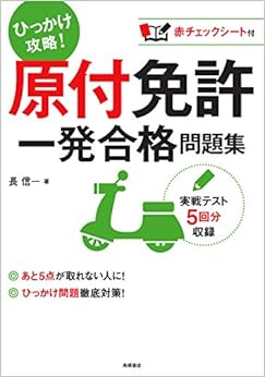 赤チェックシート付 原付免許 一発合格問題集 (高橋書店の免許対策シリーズ) (日本語) 単行本(ソフトカバー) – 2017/3/11 - 2017年道交法対応! 1回で受かるための最強メソッド。 ---多くの受験者がはまった「ひっかけのワナ」から緊急脱出! --- 頻出のひっかけ問題を5つに分類し、対策を丁寧に解説。「例題→練習問題」ですぐに確認できるからもう間違えない! 赤シート付。 【みんなココで間違えた ひっかけ問題徹底対策】 ●プラス5点を実現する「ひっかけ対策メソッド」 免許試験で多くの受験者が苦手とするのが「ひっかけ問題」。「数字」「例外」…など問題を5つのパターンに分類し、対策と覚えるポイントだけをまとめています。直後の例題や練習問題ですぐに力試しできるから、効率的に覚えられます! ●超重要ルールの解説も充実。一発合格を強力サポート! 多くのイラストを使って、試験によく出るポイントをわかりやすく紹介。重要ルールのおさらいにもぴったりです。試験範囲をカバーしているから、これ1冊でしっかり対策できます。赤シート対応で、暗記にも便利! 【重要ルールをイラストで一気に復習】 試験によく出る交通ルールを、イラストを使ってわかりやすく解説。ポイントがまとまっているから、時間のムダなく覚えられる。赤シート対応で、サクッと重要なところだけマスター! 【厳選! 頻出問題 実戦テスト(5回分)】 問題をたくさん解いて慣れておくことが、一発合格への近道。本試験と同じ形式の実戦テストをたっぷり収録しました。解説の重要なところが赤シートで隠せるから、答え合わせしながら暗記にも使えます。これさえできれば合格間違いなし! ! 【直前対策に使える。超頻出! 要チェック暗記ポイント】 巻頭には、大事なところだけ集めた「要チェック暗記ポイント」を掲載。試験直前の復習に使えて、便利!